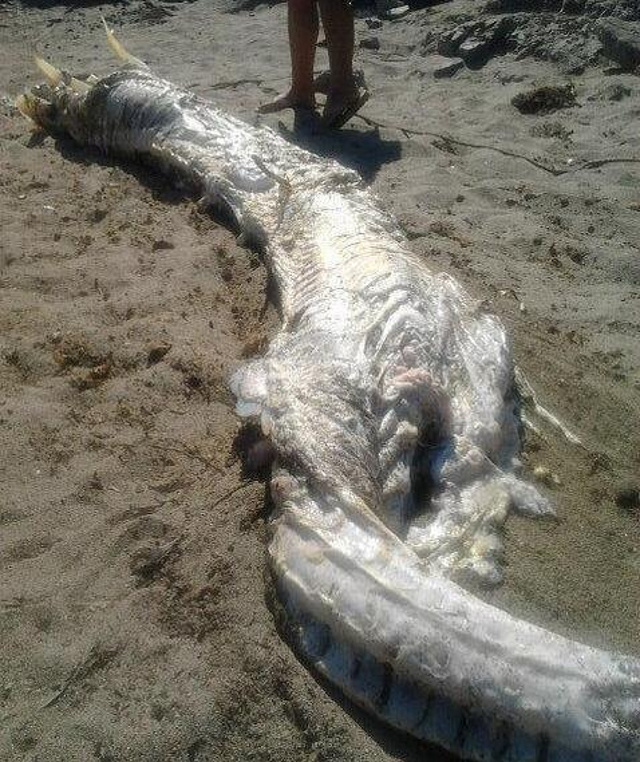 Photograph of the thirteen foot “horned mystery carcass” which washed up in Spain this year. Experts identified it as a shark of some species, with the horns likely being the pectoral girdle showing. Could the animal seen by Joass have been a similar “pseudoplesiosaur” carcass? (Image Source is here) |