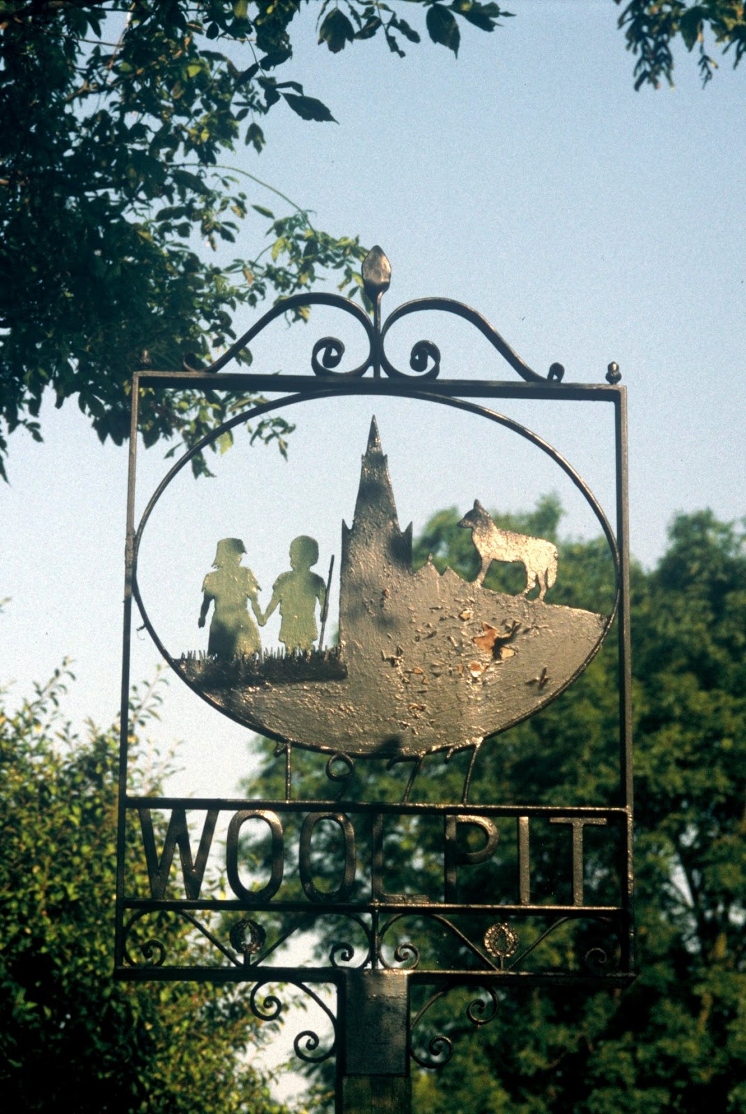 Close-up of top of Woolpit’s village sign, portraying the green children and a wolf (Dr Karl Shuker)