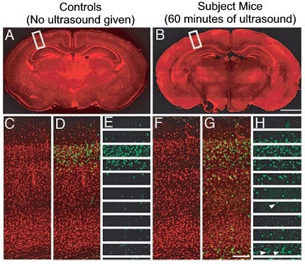 The results of a 60 minute exposure is shown in this graphic. The control is on the left, labeled A, C, D, and E. The results of the mouse that had received ultrasound is on the right, labeled B, F, G, and H. The top two images show the locations of the slices.